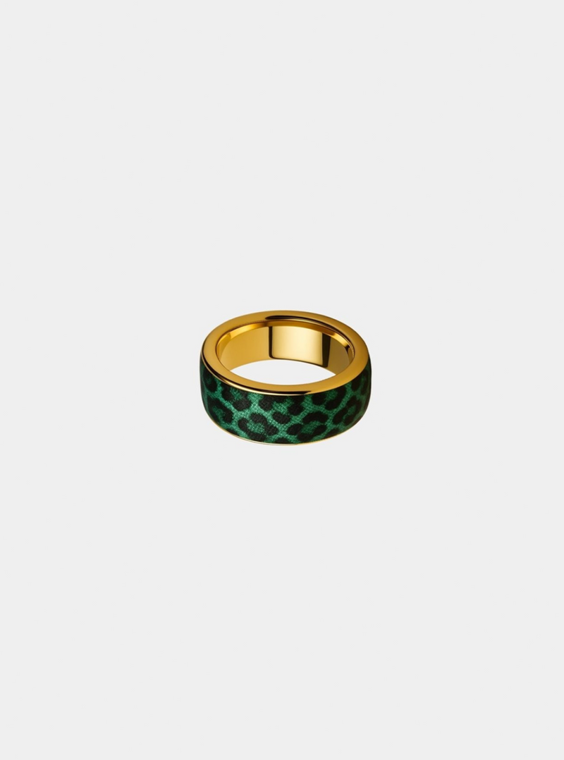 A lush green leopard-print sleeve wrapped in high-shine gold that takes your ring from every day to electric in one snap. Designed to sit completely outside your ring’s sensors, it keeps your tracking sharp with zero interference and zero compromise, while the sleek, glossy finish brings a hit of untamed glamour to every move. Wear it when you’re feeling bold, swap it when the mood shifts, because syncing with your body should never mean toning down your edge.