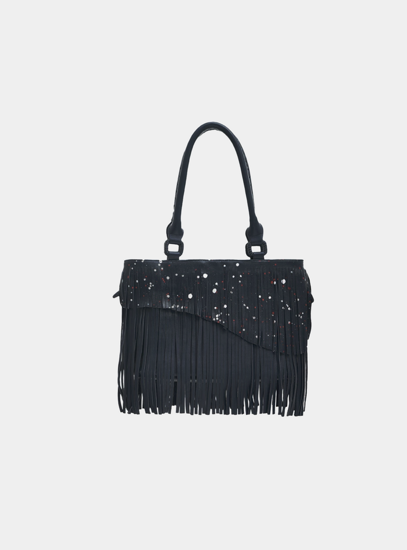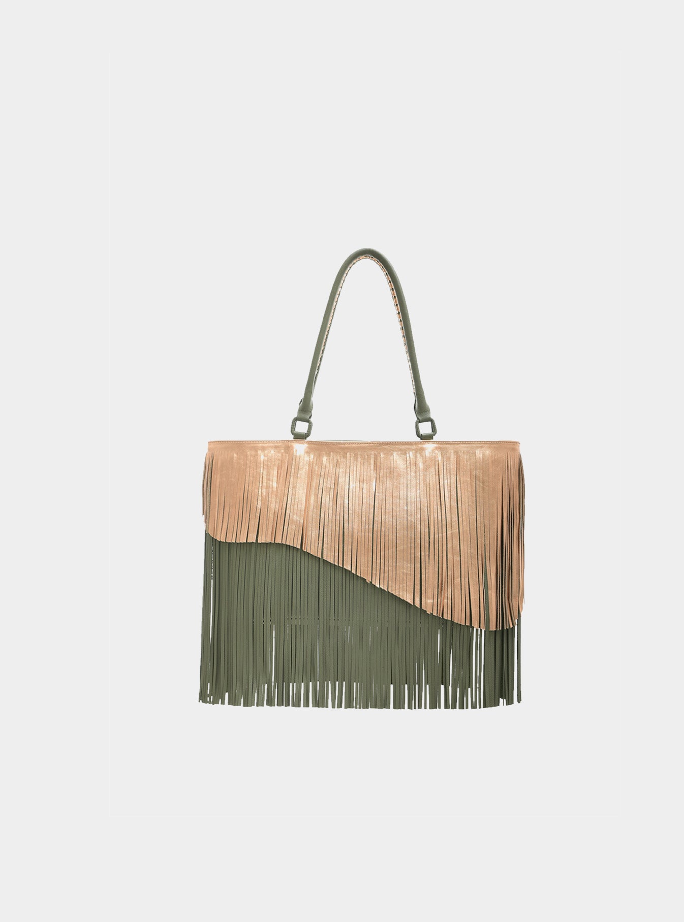 Comes with our signature Tala Fringes. A discreet front flap allows you to securely stow and access your frequently used valuables. The interior of another opens to reveal a removable, totally tote-able pouch that can be handheld or cross-bodied. The handles allow the bag to be carried by hand, tossed over the shoulder, or convert it to a crossbody with the included strap. The two-tone, dual-level fringe is guaranteed to have you turning heads wherever you go.